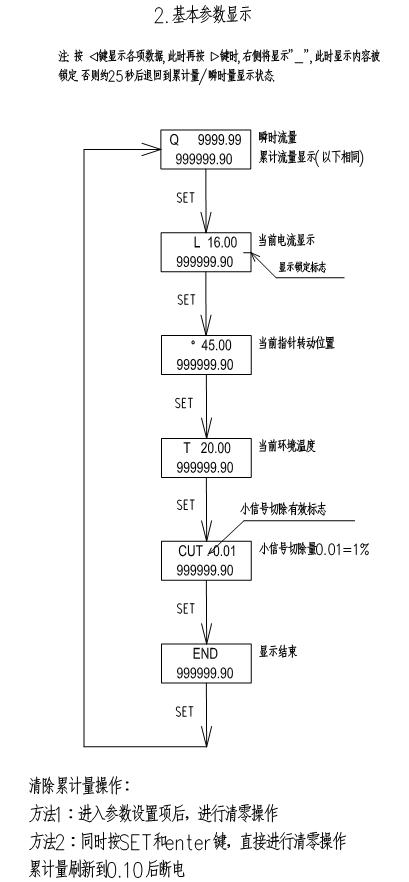 2.上排可切換顯示:瞬時流量,環(huán)路電流,累計小信號切除量,當(dāng)前環(huán)境溫度,指針轉(zhuǎn)動角度等信息.此時不影響下排累計量的顯示