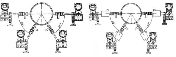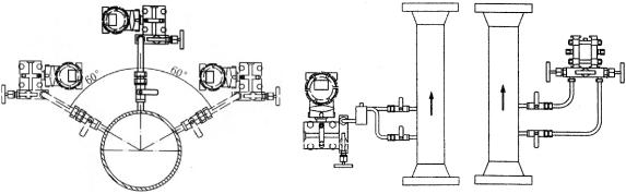 ?、?如圖 4 和 5 所示:測量液體和水蒸汽介質(zhì)流量時,取壓管口 安裝角度為 0°和180°;如果在 0°和 180°不可能安裝時,可在 0°~60°和 120°~180°范圍內(nèi)選擇。但差壓變送器必須垂直安裝在三閥組的垂直端面上。