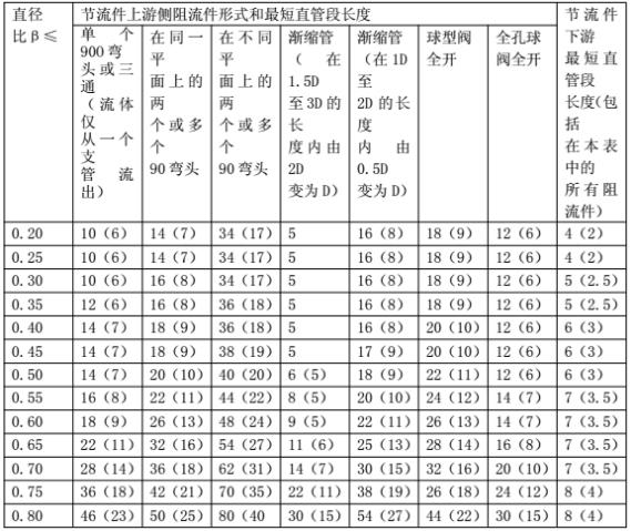 IS05167 標準中孔板與阻流件之間所要求的直管段長度比β有關(guān)(β=d/D, d 為孔板開孔直徑,D 為管道內(nèi)徑),具體長度見下表(二):