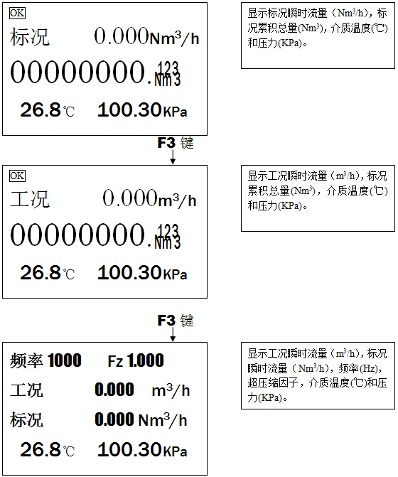5.1.2瞬時流量可切換顯示標(biāo)況體積流量(Nm3/h)和工況體積流量(m3/h),最多可保留3位小數(shù),顯示 值為9999999;
