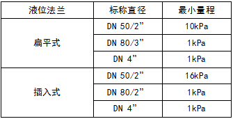 注4:液位變送器的最小量程應為表1和表2中最小量程的較大值。調節(jié)的量程不得小于最小量程。為了使液位變送器性能最優(yōu),應選擇量程比<10:1。