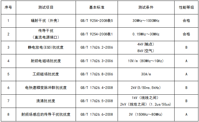 (2)B性能等級說明:測試時,功能或性能暫時降低或喪失,但能自行恢復,實際運行狀況、存儲及其數(shù)據(jù)不改變。
